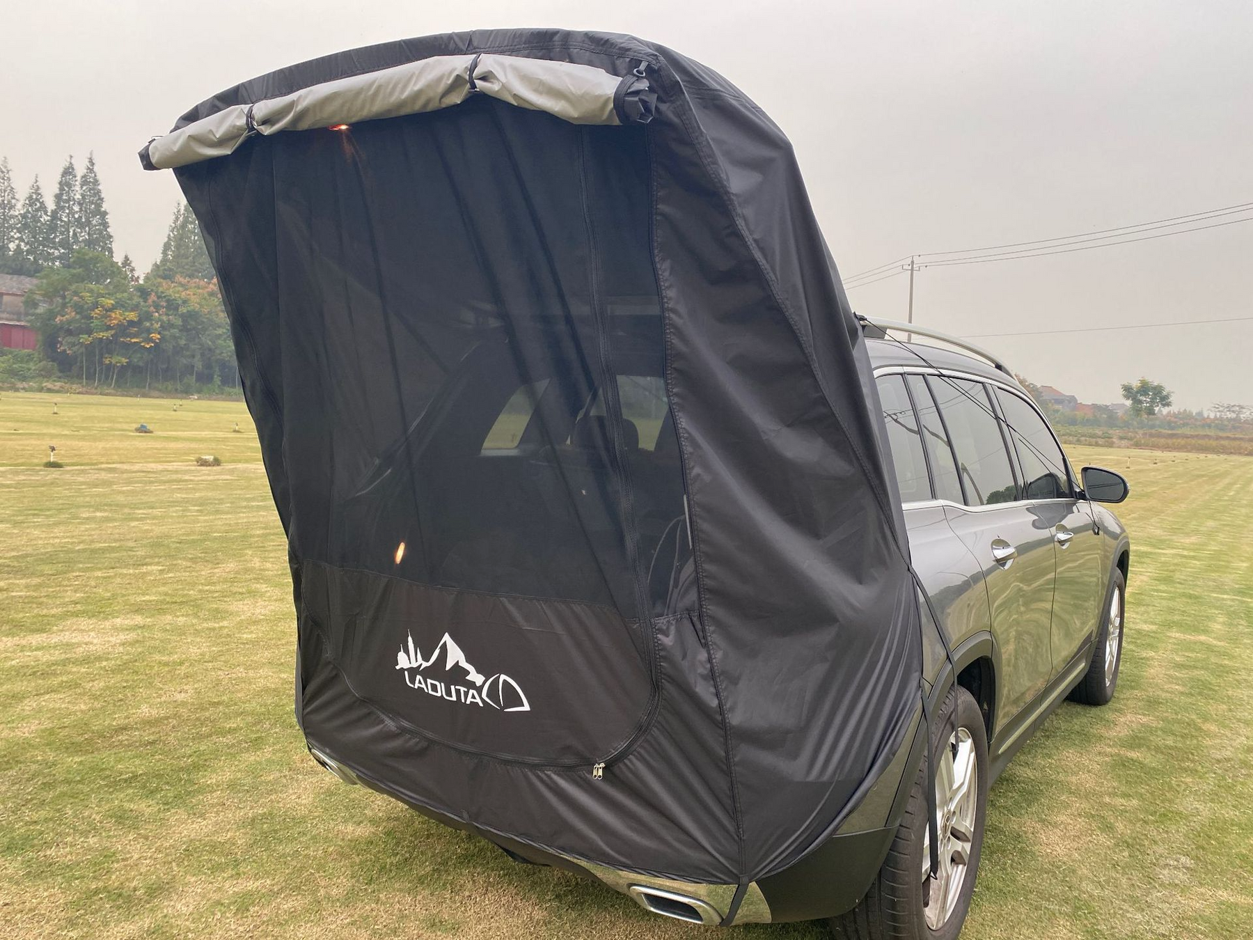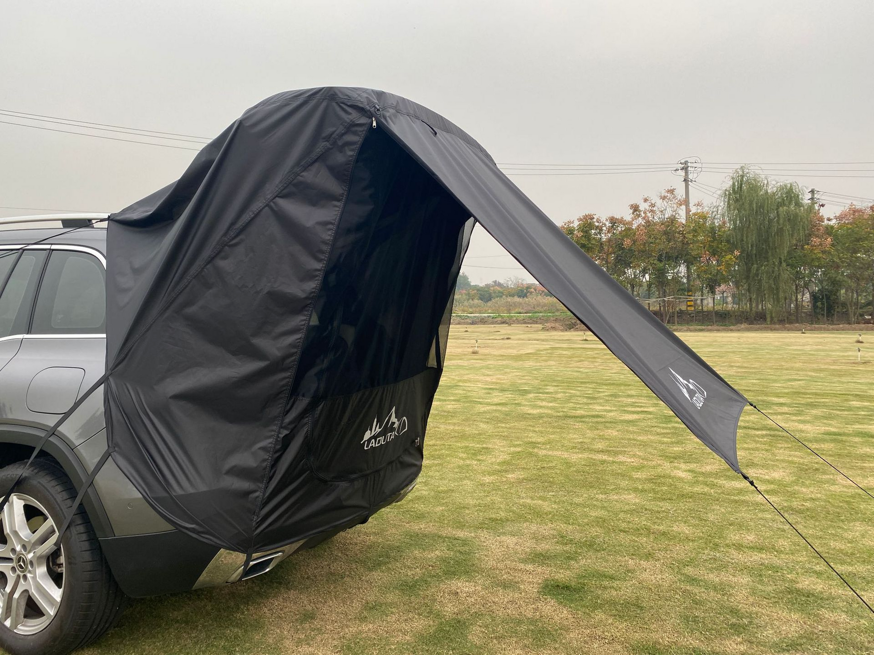 Med detta slitstarka och vädertåliga reseförtält är du skyddad mot både sol och regn. Tältet har elastiska band och ansluts runt bilens bakdel och baklucka.