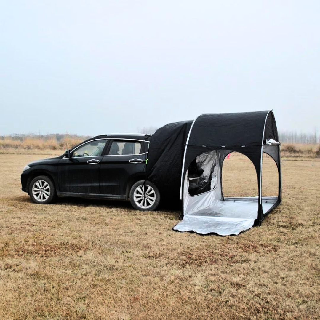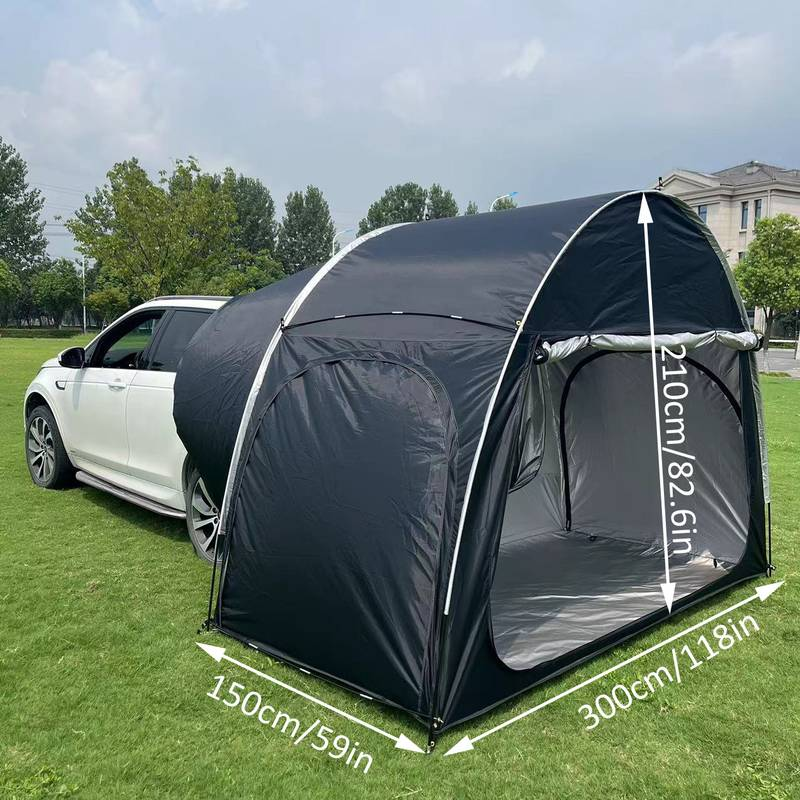 Detta slitstarka och vädertåliga tältet skyddar dig mot både sol och regn. Tältet har elastiska band som gör det enkelt att fästa runt bilens bakdel och baklucka. Tack vare dess flexibla och justerbara konstruktion, passar tältet på både större och mindre bilar med en höjd på mellan 160 och 200 cm.
